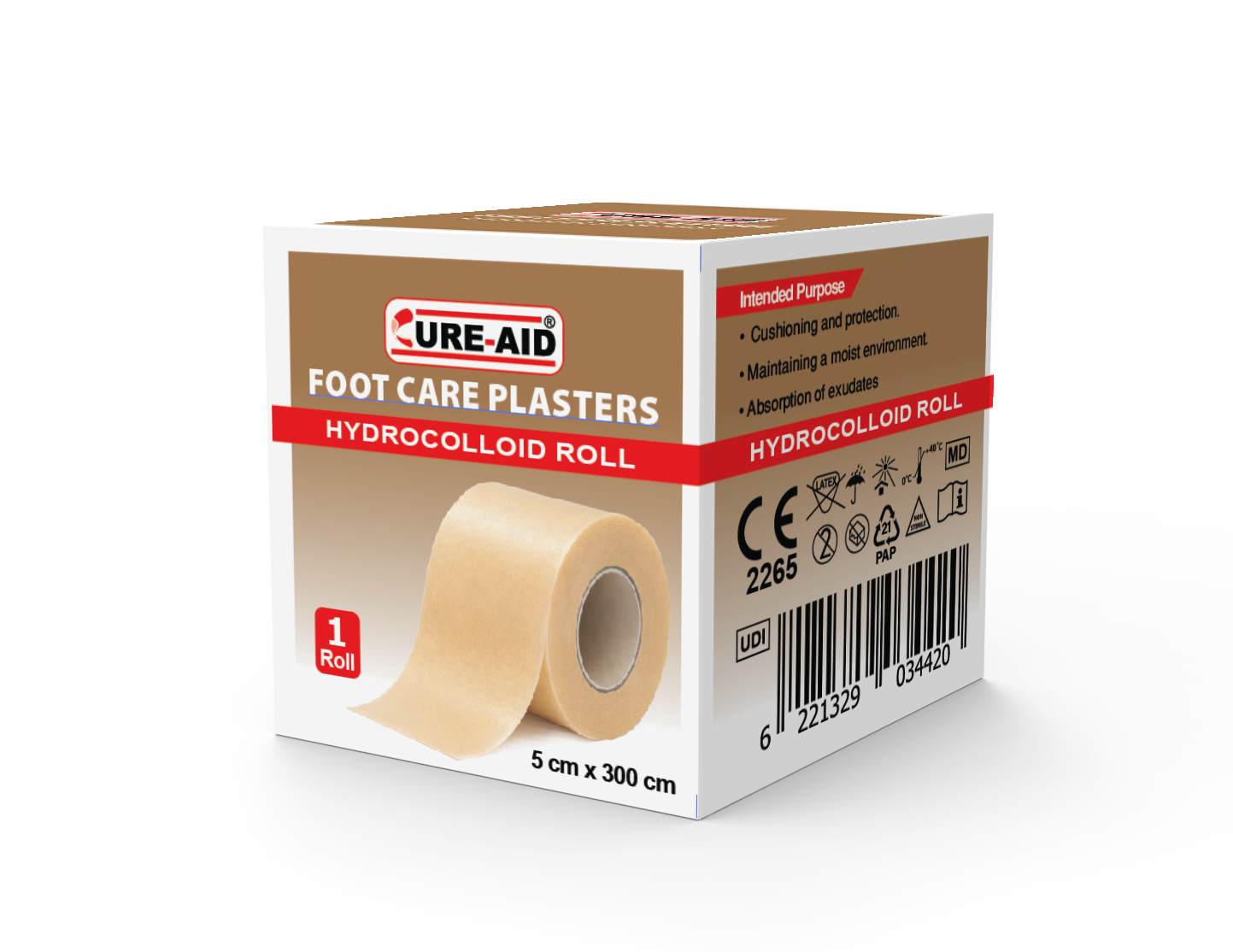 Cure-Aid® foot care plasters in rolls are hydrocolloid dressings designed to protect and relieve pain from blisters. With advanced hydrocolloid technology, they cushion the skin, reduce friction, and absorb moisture to create an optimal moist healing environment that accelerates natural wound repair. Providing instant pain relief and long-lasting protection, these dressings adhere securely for up to 7 days, helping you stay active with confidence in daily life
